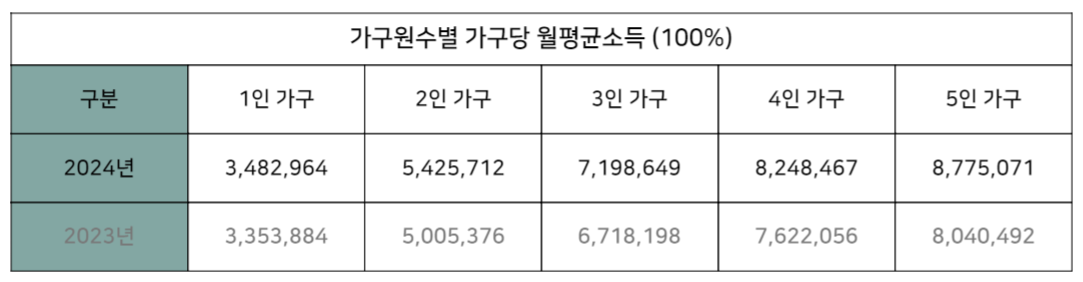 **태아를 포함한 가구원 수가 4명 이상인 세대는 가구원수별 가구당 월평균소득으로 적용