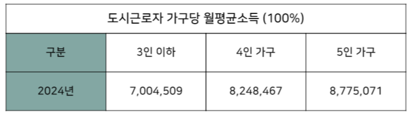 - 2023년도 도시근로자 가구원수별 가구당 월평균 소득의 100% → 3인 기준 7,198,649원